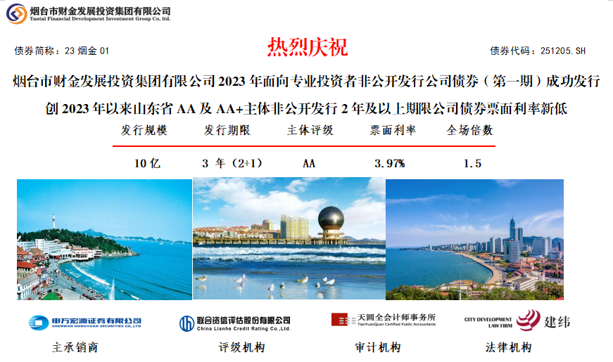 6月6日,煙臺(tái)財(cái)金集團(tuán)2023年面向?qū)I(yè)投資者非公開發(fā)行公司債券(第一期)成功發(fā)行。本期債券發(fā)行規(guī)模10億元,期限3年(2+1),票面利率3.97%,全場認(rèn)購倍數(shù)1.5倍,集團(tuán)作為AA主體,創(chuàng)2023年以來山東省所有AA、AA+主體非公開發(fā)行2年及以上期限公司債券票面利率新低,且票面利率低于山東省2023年以來同級(jí)別、同期限非公開公司債253BP以上。本期債券發(fā)行由申萬宏源證券有限公司主承,聯(lián)合資信、天圓全會(huì)計(jì)師事務(wù)所及建緯律師事務(wù)所分別提供信用評(píng)級(jí)、審計(jì)和法律服務(wù)。